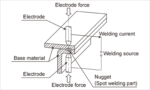 To place overlapped base material between two electrodes whose tip being formatted properly, heats locally and presses a relatively small part of it by concentrating of current and welding pressure simultaneously.