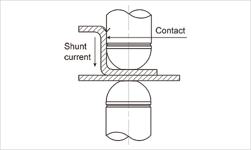 Note: There are 2 ways of shunt current. One occurs when a material to be welded comes into contact with an electrode holder or a side face electrode, another occurs by structure of member or existing welding point inevitably. The former has to be prevented.
