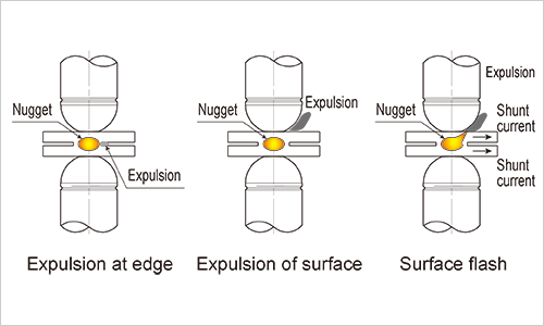 Note: There are 3 ways of expulsion. First one is expulsion of surface which occurs to the outside surface of a base material and an electrode tip. Second one is expulsion at edge which occurs between base materials. The last one is surface flash (occurs to series spot welding) to scatter metal of the inside of a nugget to the surface.