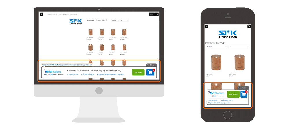1.When you access the website from overseas, the “WorldShopping Cart” will be displayed automatically.
