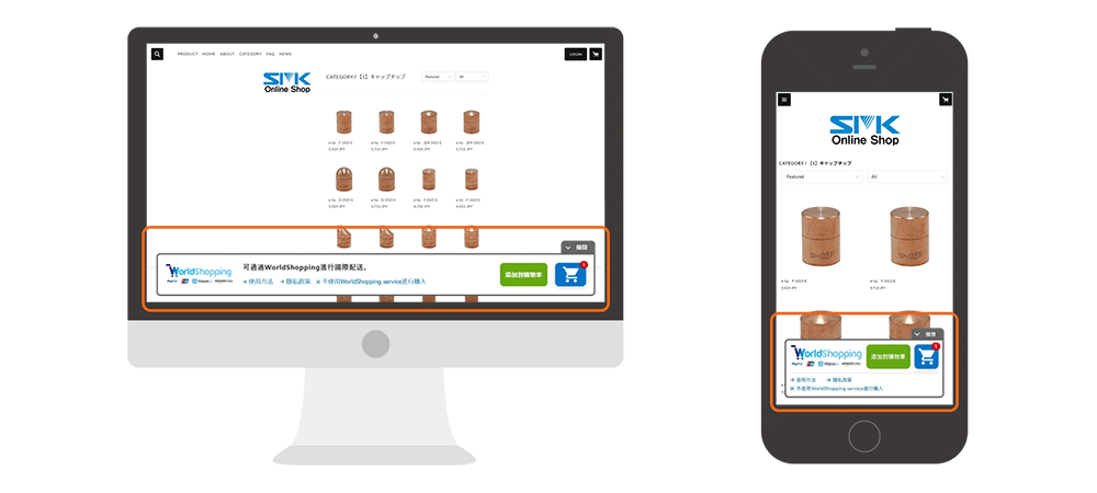 1.當您從日本以外的國家/地區訪問網站時,在頁面底部會自動顯示“WorldShopping Cart“(WorldShopping的購物車圖標)。