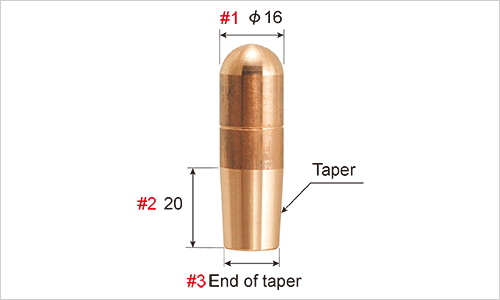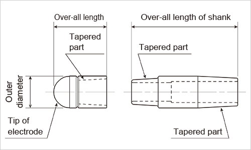 There are tip shapes of electrode being printed on this catalog. You can use them properly, due to the shape of work piece. Cap Tip type electrode which enables easy replacement of only a tip is often being used for material saving and cost reduction.