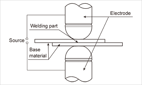 To place overlapped base material between two electrodes whose tip being formatted properly, heats locally and presses a relatively small part of it by concentrating of current and welding pressure simultaneously.